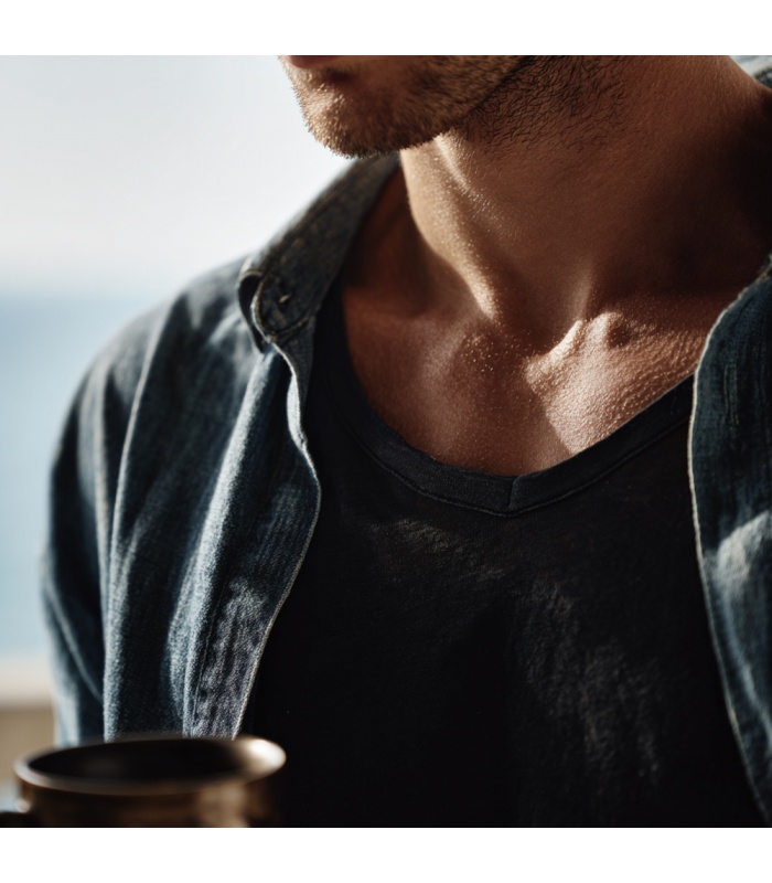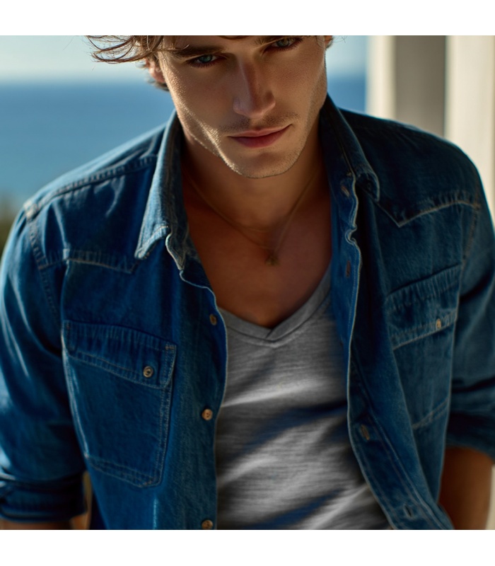 Tricoul V-neck "sub camasa" este fabricat din jerseu de 175g/mp din 100% lana merinos naturala, nevopsita. Varianta pe negru are densitatea de 185g/mp. Lana folosita este de inalta calitate, extrem de fina si placuta, culoarea materialului avand, in lumina naturala usoare reflexe metalice ce aduc aminte de matase.
