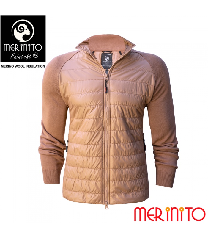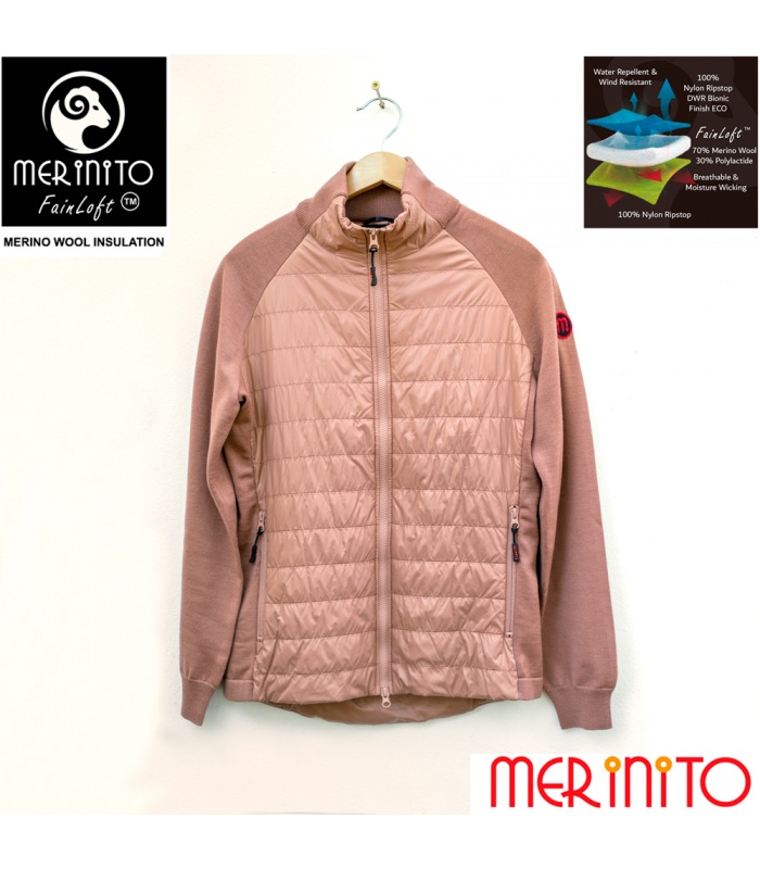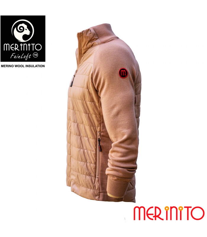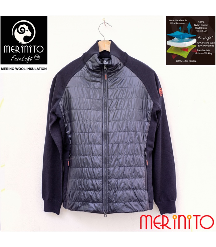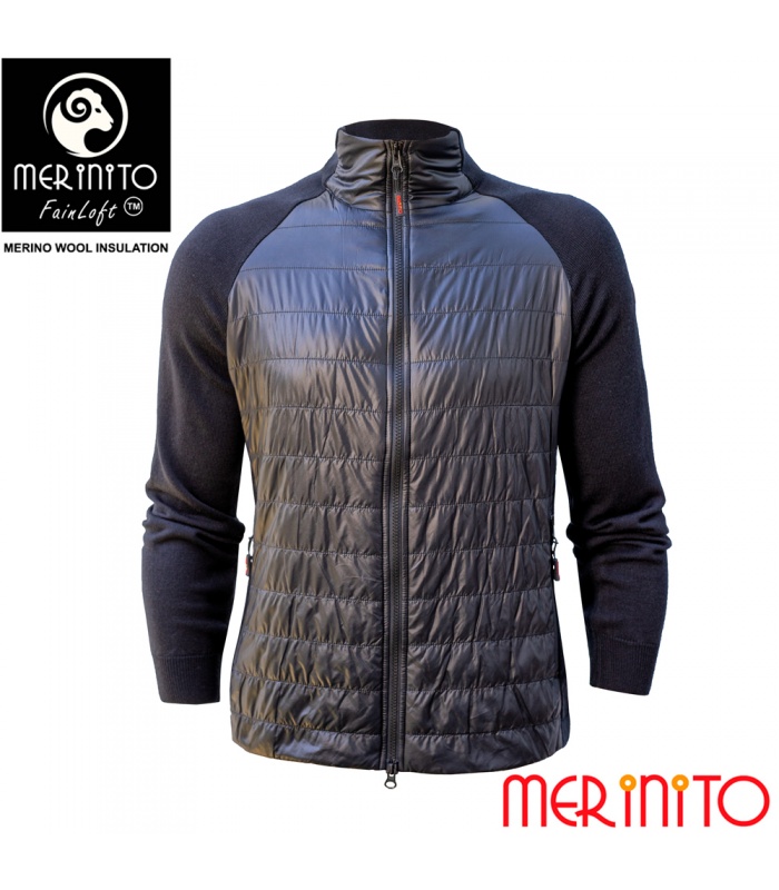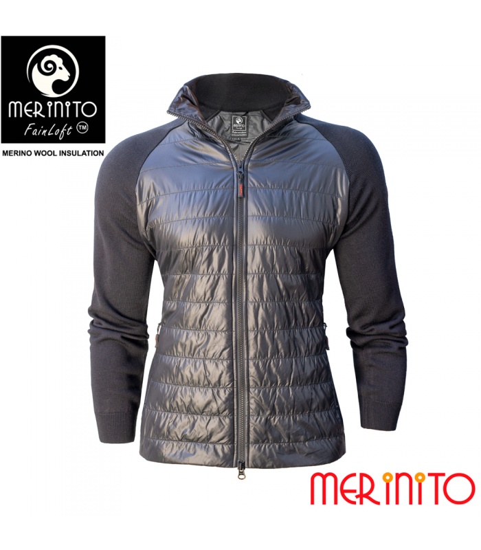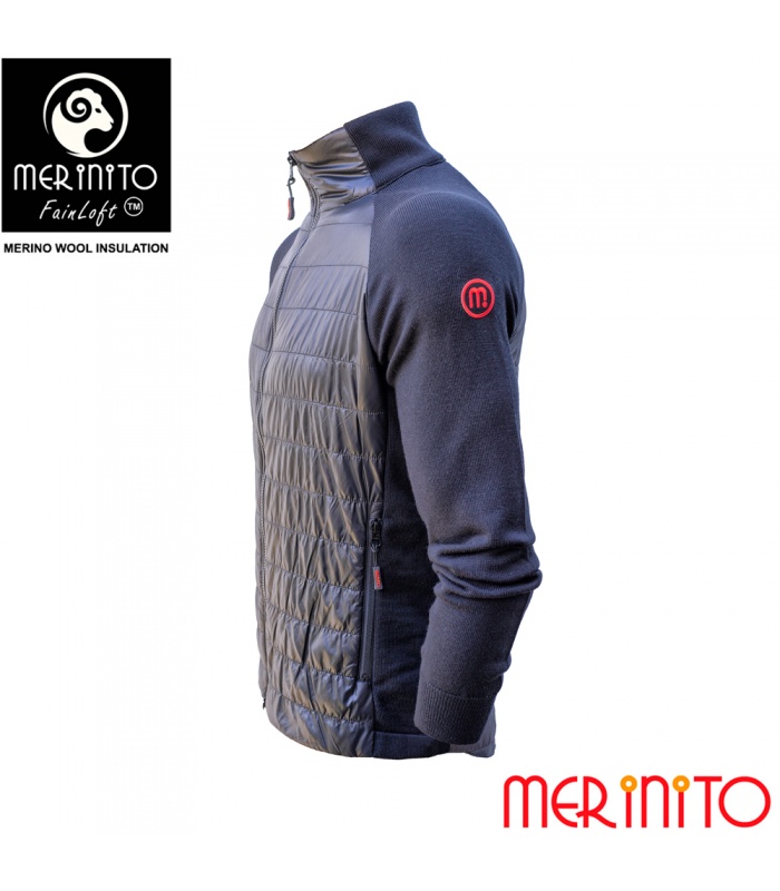 Jacheta Merinito Hybrid cu izolatia FainLoft (marca inregistrata de catre Merinito) este o jacheta de tranzitie hibrida, o combinatie inteligenta de materiale cu proprietati diferite intr-un singur produs: respirabilitate maxima si izolare doar acolo unde este nevoie. Ofera confort si protectie in zilele reci ale anului, poate fi purtata 3 anotimpuri, este usoara, nu produce supraincalzire, se usuca rapid, este rezistenta la mirosuri datorita lanii merinos si isi pastreza calitatile si atunci cand este umeda (spre deosebire de jachetele izolate cu puf/pene).