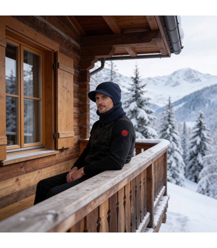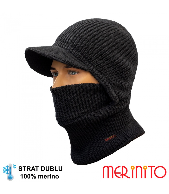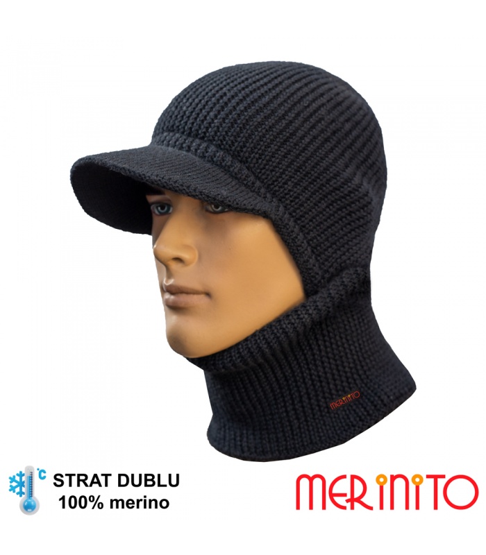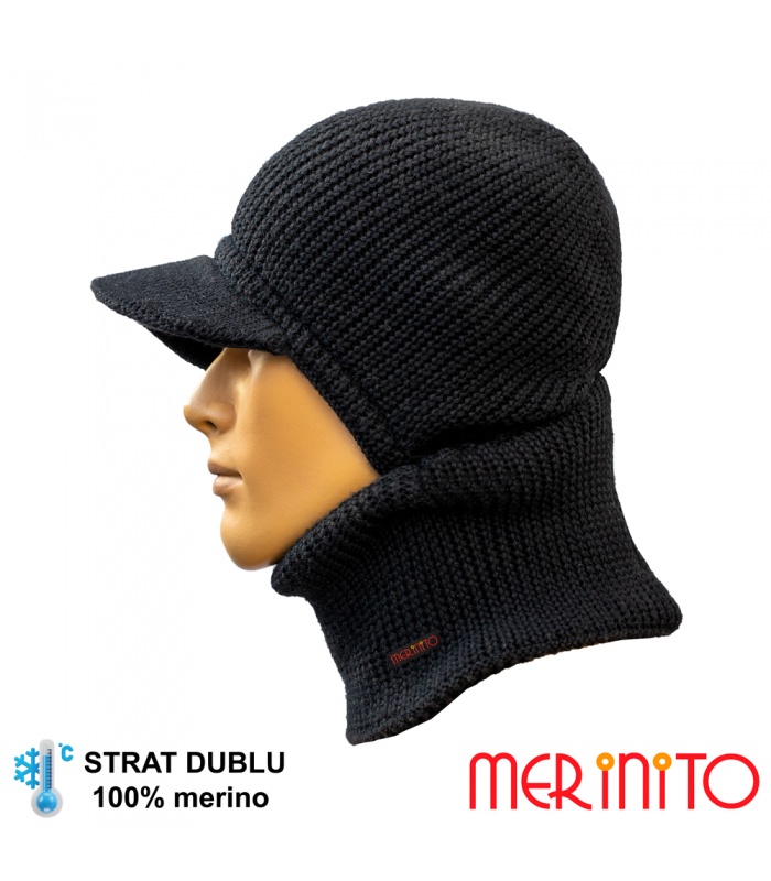 Caciula Merinito cu cozoroc este tricotata in strat dublu de lana merinos 100% fiind extrem de calduroasa chiar si la termperaturi extreme. Design-ul este unul multifunctional: gulerul se poate ridica si astfel protejeaza fata ca si o cagula. Este ideala in sezonul rece pentru orice activitate in aer liber.